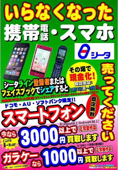 | ★★★シータで携帯・スマホ・タブレット強化買取実施中★★★ ★★ 11月25日(火)~11月30日(日)まで 期間限定 割増企画開催 ★★ 期間限定! アップル買取フェア開催! 今週はアップル商品の高価買取フェア開催します! いらなくなった iPhone iPad iPod をシータへ売ってください! 指定のiPhone以下アップル端末機器なら、 通常より!1000円以上割り増しで買取します! 不要になったアップル機器をその場で現金買取します! ★割増適用条件・・・ ○シータ配布した携帯買取チラシをご持参した方 ○シータLINE@友だち登録をいただいている方なら1000円割増買取します! (これから登録でもOK!)でFACEBOOKでご来店のシータショップを「いいね」 &こちらの内容を「シェア」いただいた方も対象です! ○割増条件:シータ指定の買取品の場合で買取時に割増します! iPhone 6 6 plus 5S 5C 4S 4 各色 正常動作品。 iPhone3/3GS対象外。 iPad Air Ari2。 iPad mini mini2 mini3。 正常動作品。 2009年以降発売のiPod各モデル 付属品付。 上記以外のアップル商品でも、通常よりできる限り高く買い取ります。 端末に傷・故障がある場合など一部割増対象外となる場合があります。 また、完品でない場合、状態によって買取値が減額になります。 また、当キャンペーンは予定数に達し次第予告無く終了とさせていただきます。 予めご了承下さい。 ○他の割増キャンペーンとの併用はできません。予めご了承ください。 ★期間限定!アップル機器買取割増実施中!★ いらなくなった iPhone iPad iPod をシータへ売ってください! シータ指定のアップル機器なら、通常買取より、1000円高く買取ります! この機会に是非お持ちください! この他 携帯ガラケー・タブレット・ゲーム機本体も買取査定無料! 携帯スマホ売るならやっぱりシータ! 是非ご来店ください! 登録 いいね!シェア!いただいたお客様! この機会に、ぜひシータにご来店ください!! ★シータの新しいサービスご存知ですか! ※iPhone修理サービス!好評受付中!! 液晶割れ!動かない!バッテリーがおかしい! 困った時はお持ちください!シータでiPhone修理できます。 ※携帯パワーコーティングサービス!その場で承ります! もう保護シートはいらない! 美しく!強化ガラス並みの強度でスマホを守ります! ※シータはパソコンショップのアプライドグループの一員です! パソコントラブル解決します! 困った時は是非!シータにお持込ください! 専門スタッフがお客様のPCトラブル解決に駆けつけます! ★シータオンラインショップ! オープン! ネット激安価格でご来店お待ちしています!!! ぜひアクセスお待ちしてます! ↓↓↓↓ http://theta.comroad.co.jp/ ★中古携帯専門サイト ACCEL PARKオープン! iPhone スマホ ガラケイならアクセルパークにお任せください! ↓↓↓↓ http://www.accel-park.jp/ ★オークションならシータ! ゲームの他 中古携帯、中古タブレットも掘り出し物をたくさん載せていきます! ↓↓↓↓ http://storeuser4.auctions.yahoo.co.jp/jp/user/com5822 こちらもお買い得品がいっぱい!ぜひアクセスお待ちしてます! また各店にてゲーム・携帯・タブレット・音楽プレーヤー高価買取中! ◎シータポータルサイト→ http://www.comroad.co.jp/ |